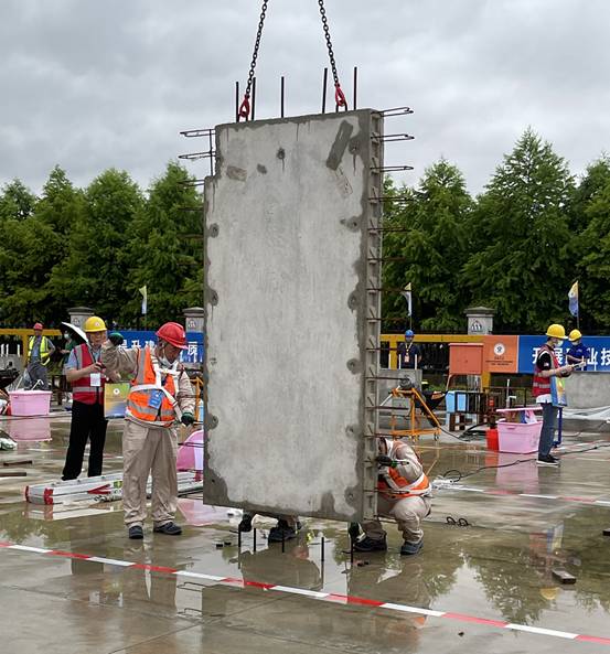 我司代表隊參加了構件裝配組決賽,分為理論和實操。考核內容為預制剪力墻安裝,過程中對操作安全、構件入場檢查、檢查預留筋位置、吊裝準備、吊裝、構件安裝質量、團隊合作等7個方面進行考核打分。
