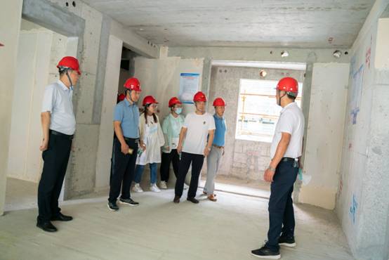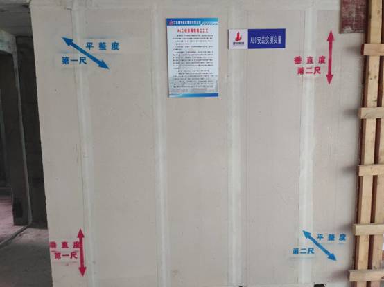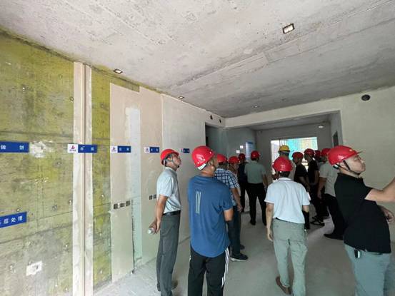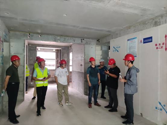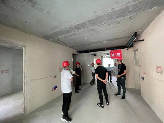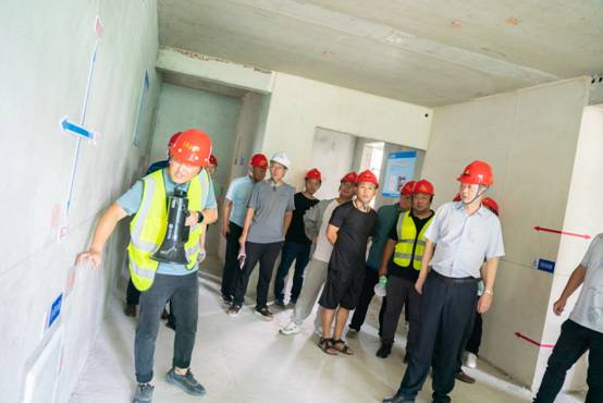 全體觀摩人員同樣分成了三組,在項目現場管理人員的帶領下深入施工場地,重點觀摩了14#樓、22#樓、26#樓粉刷施工工藝樣板、實測實量樣板;預制剪力墻、預制疊合板、預制樓梯、ALC板等施工成型質量情況。