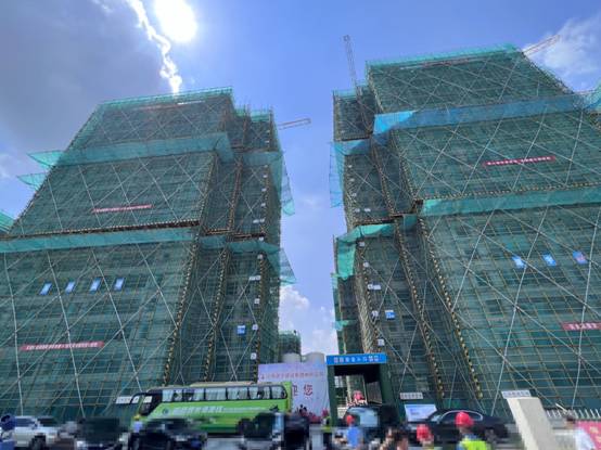 觀摩團第一站:天賦星辰項目,該項目建筑面積為107121.54 ㎡,其中地上12 棟單體住宅樓建筑面積為74340.92 ㎡,地下為一層車庫及人防,建筑面積為32780.62 平米。目前已經有8 棟全部封頂, 3棟樓二次結構快要完成,3棟屋面做法及外墻抹灰完成,2棟屋面做法正在施工。