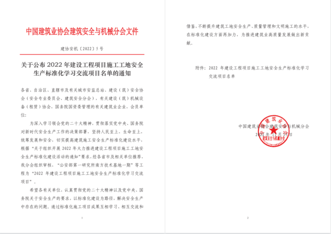 近日,中國建筑業(yè)協(xié)會安全與機械分會發(fā)布了2022年建設(shè)工程項目施工工地安全生產(chǎn)標(biāo)準(zhǔn)化學(xué)習(xí)交流項目名單,集團南京分公司承建的國際化名醫(yī)中心項目安全標(biāo)準(zhǔn)化建設(shè)成績顯著,被授予“國家安全生產(chǎn)標(biāo)準(zhǔn)化項目”榮譽稱號(原國家AAA工地)。