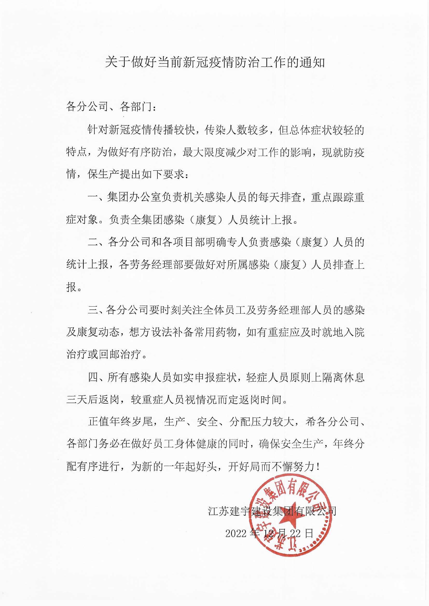 隨著疫情防控新十條的發(fā)布,集團(tuán)針對疫情防控面臨新形勢、新階段、新任務(wù),及時調(diào)整防控策略,及時發(fā)布了《關(guān)于做好當(dāng)前新冠疫情防控通知》,各分公司迅速貫徹實(shí)施,根據(jù)每天感染情況,積極作為。