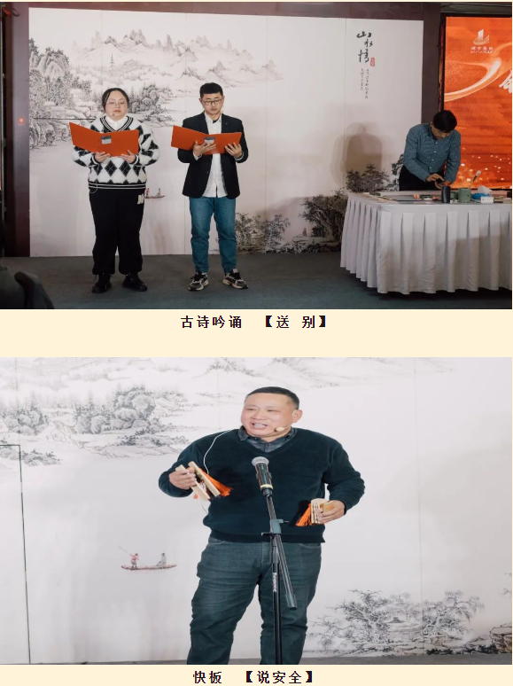 詩(shī)朗誦《筑夢(mèng)之路》、古詩(shī)吟誦《送別》、小品《查抽煙》、快板《說(shuō)安全》、口琴獨(dú)奏《女兒情》、大合唱《大中國(guó)》、《明天會(huì)更好》、獨(dú)唱《攙扶》等元素多樣、精彩紛呈的節(jié)目把年會(huì)氣氛不斷推向高潮,贏(yíng)得全場(chǎng)熱烈掌聲與喝彩。